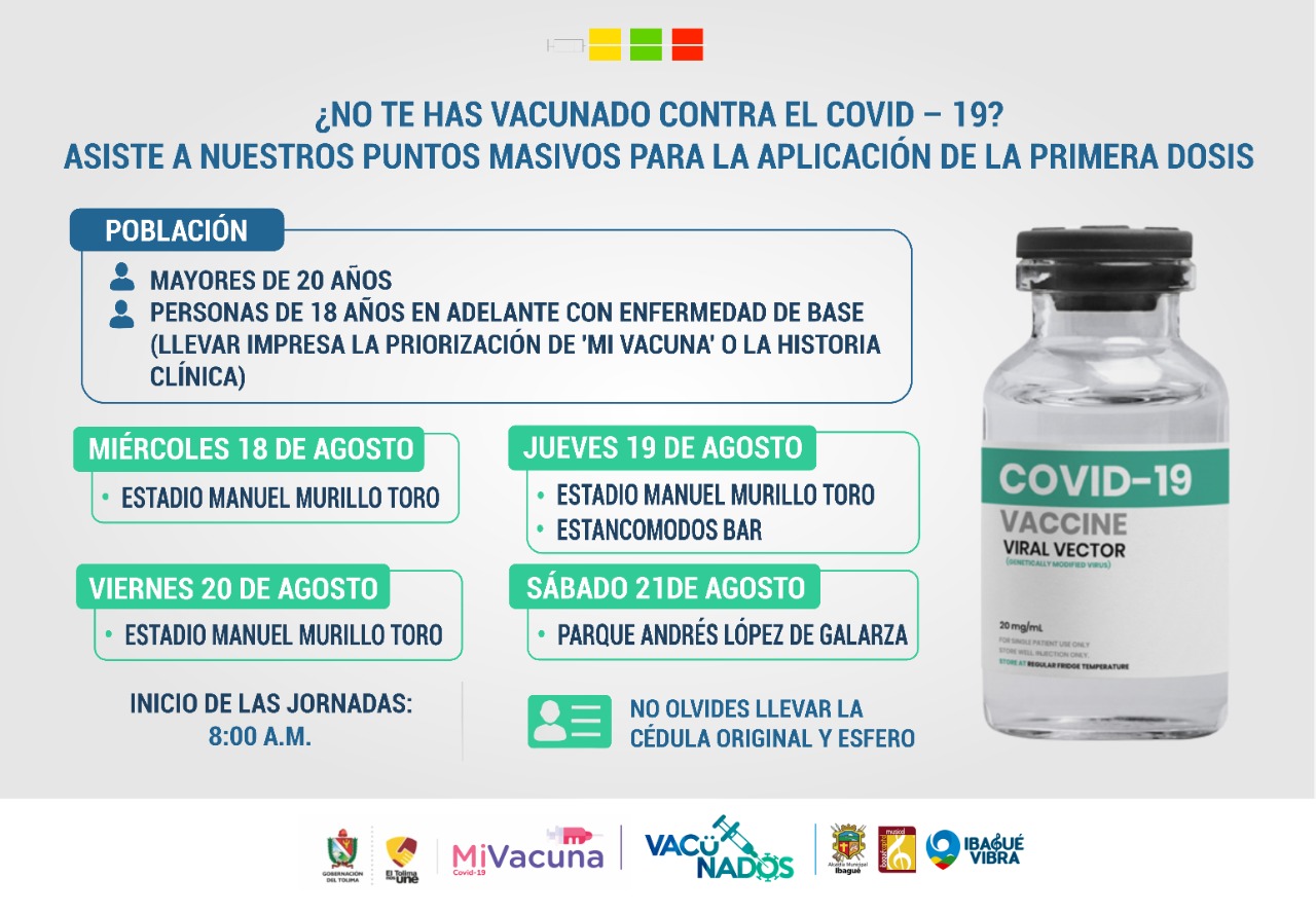 Se estarán aplicando vacunas en su primera dosis para personas de 20 años en adelante, también mayores de 18 años con enfermedades base, para este caso deberán llevar impresa la priorización la cual puede ser descargada del portal mi vacuna o en su defecto la historia clínica, para los dos casos se debe llevar la cédula de ciudadanía original y un esfero.