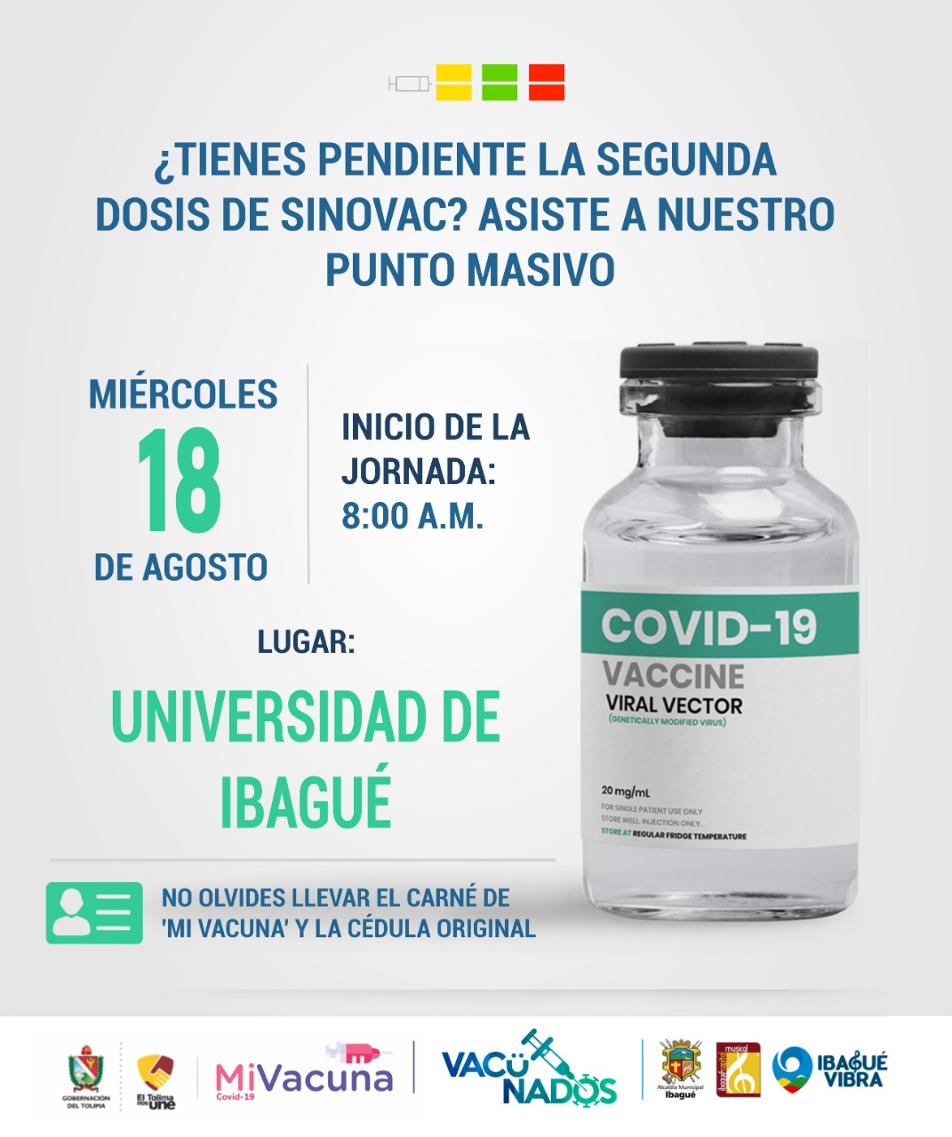 Por otro lado, se estarán aplicando segundas dosis de la vacuna SINOVAC en las instalaciones de la Universidad de Ibagué, el miércoles 18 de agosto a partir de las 08:00 AM,  los asistentes deberán llevar su cédula original y el carnet de vacunación emitido con anterioridad en su primera aplicación.