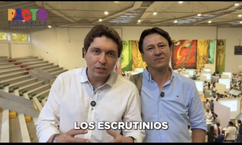 Los representantes a la Cámara electos Marco Hincapié y Renzo García se mantienen atentos al proceso de escrutinio que se adelanta en el Coliseo Menor de Ibagué, lugar donde las autoridades electorales revisan las actas y consolidan los resultados de las elecciones.